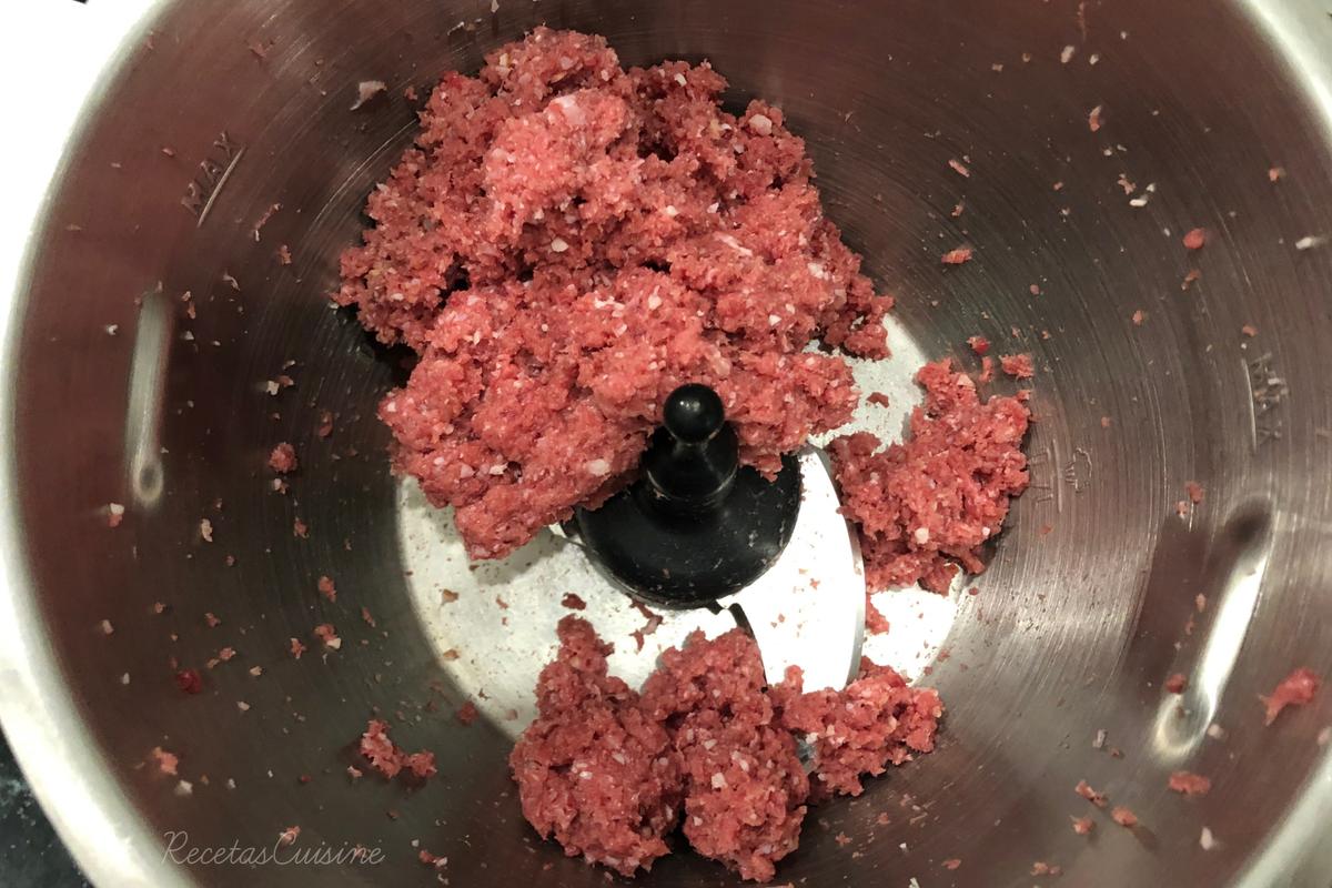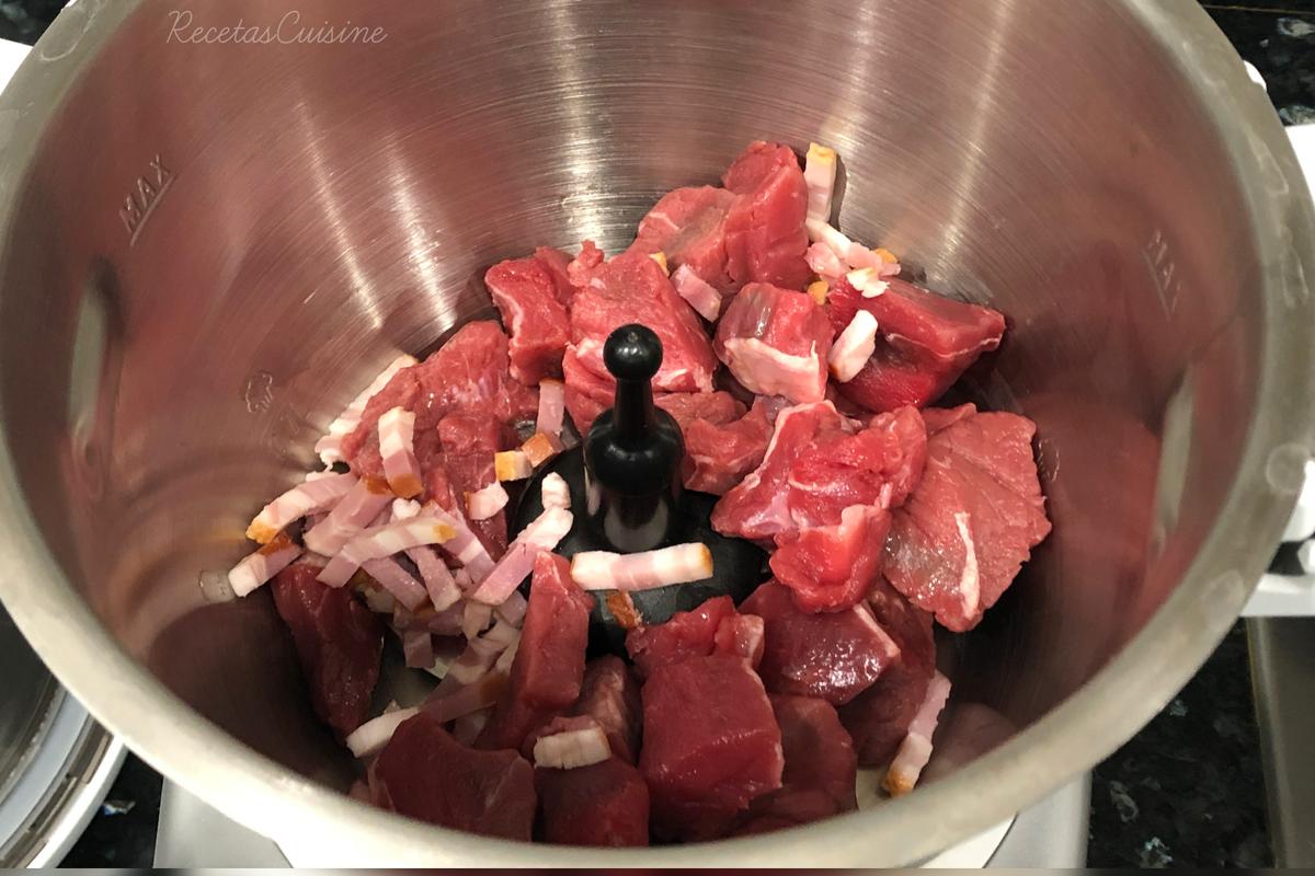 1. Comenzamos picando la carne. Para ello, equipamos el robot con la cuchilla ultrabalde y ponemos la carne que tendremos partida en trozos gruesos. Añadimos el bacon el taquitos y programamos velocidad 12, 20 segundos.