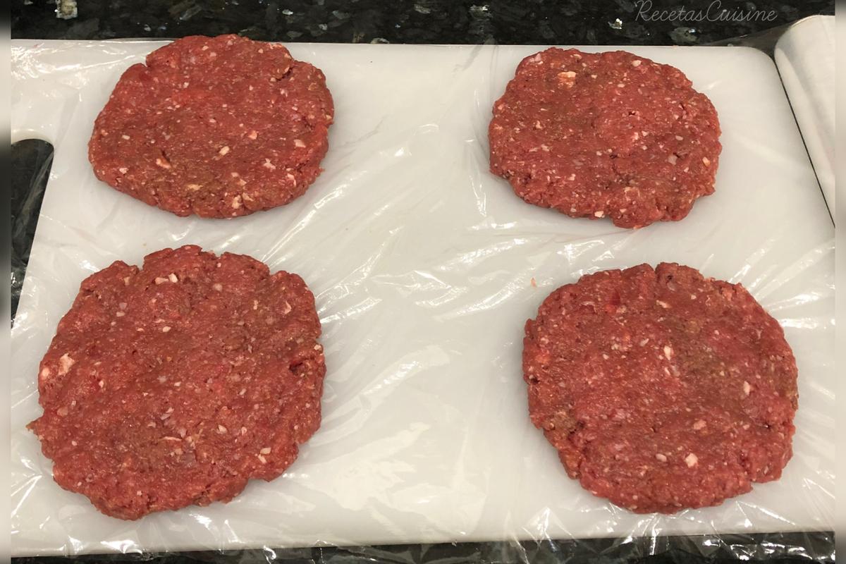 5. Con las manos, y sin apelmazar mucho la carne, formamos las hamburguesas y las vamos colocando sobre la bandeja. Cuanto menos manipulemos la carne, más sueltas y jugosas nos quedarán luego al cocinarlas.
