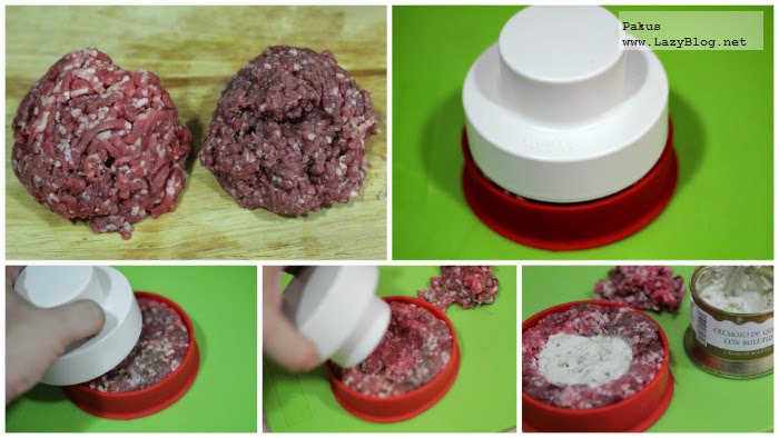 Para hacer el relleno, vamos a utilizar un curioso utensilio de Lekué, llamado kit Burger que permite hacer las hamburguesas homogéneas y del mismo tamaño, así como hacerlas rellenas como vamos a hacer nosotros ahora y veréis en las imágenes siguientes.