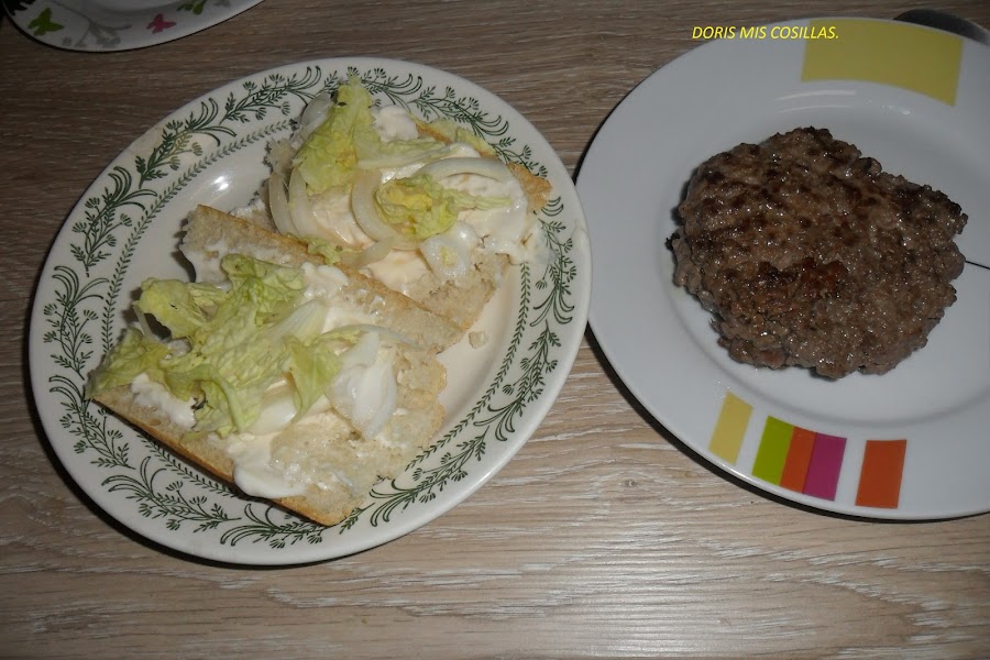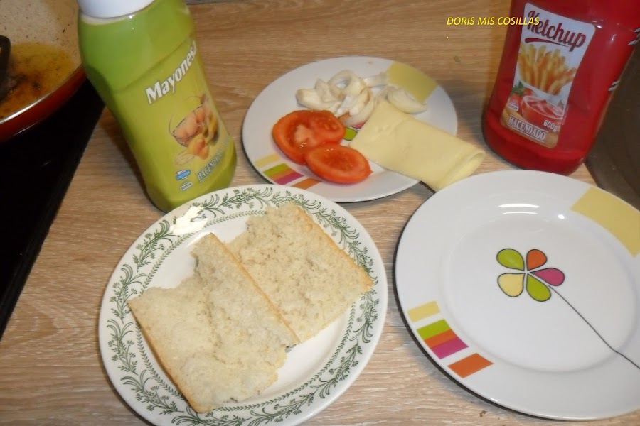 Calentamos el pan, untamos de mayonesa ,Vamos poniendo la cebolla en aritos,un poco de lechuga bien escurrida y el tomate una rodaja o dos.Regamos con el ketchup y la mostaza si gusta.