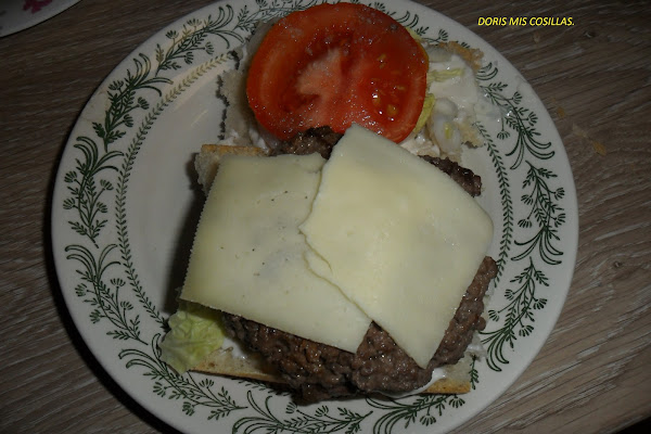 Cortamos el pan de barra lo justo para que entre la hamburguesa.Calentamos la sartén con un chorro de aceite de oliva virgen extra. En un plato ponemos nuestros 200 gr. de carne, salpimentamos ligeramente, damos forma redondeada y la ponemos en la sartén.El fuego no muy fuerte para que se quede jugosa y no cruda por dentro.Damos la vuelta, ponemos el queso unos minutos y procedemos a montar nuestra hamburguesa.