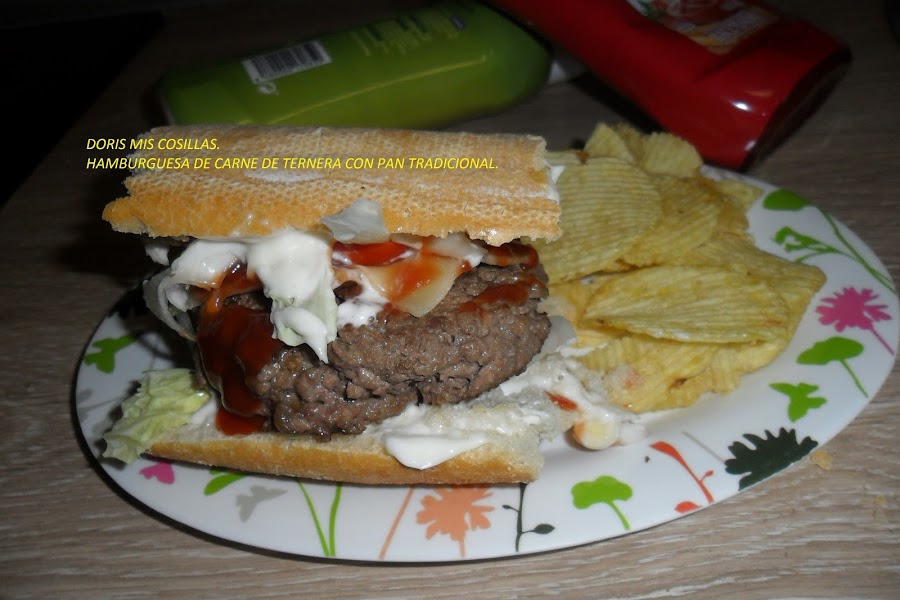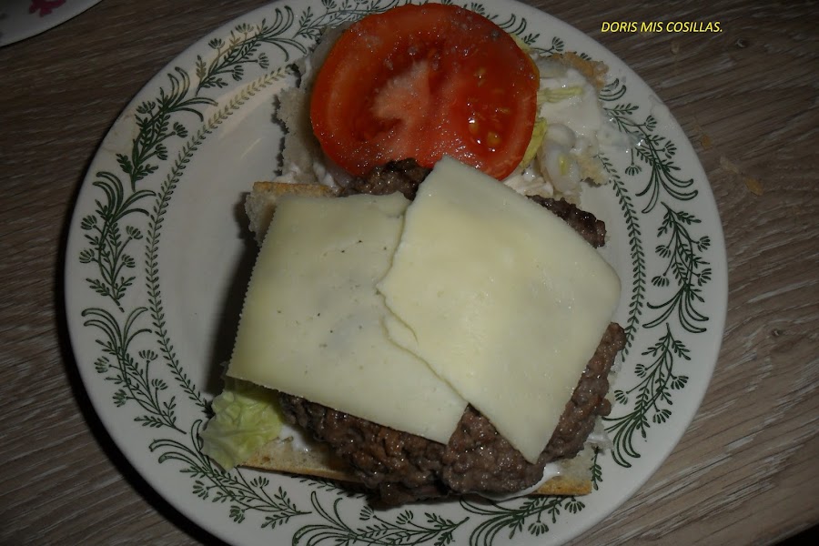 INGREDIENTES PARA HAMBURGUESA DE CARNE DE TERNERA CON PAN TRADICIONAL.