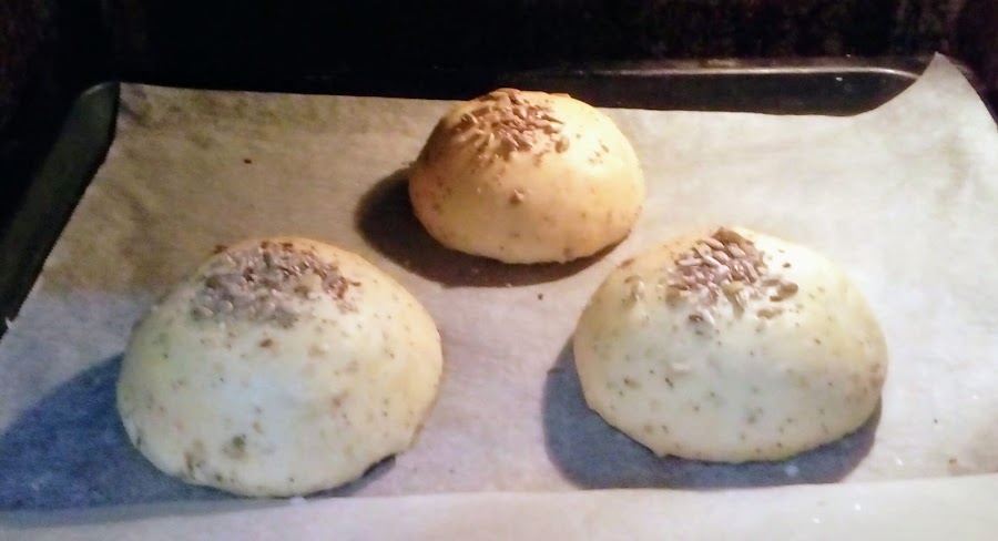 Cuando esté añadamos para quitarle el aire, hacemos 4 bolas y las ponemos en una bandeja de horno, las pincelamos con leche y espolvoreamos con el resto de semillas. Las dejamos reposar para que vuelvan a subir.