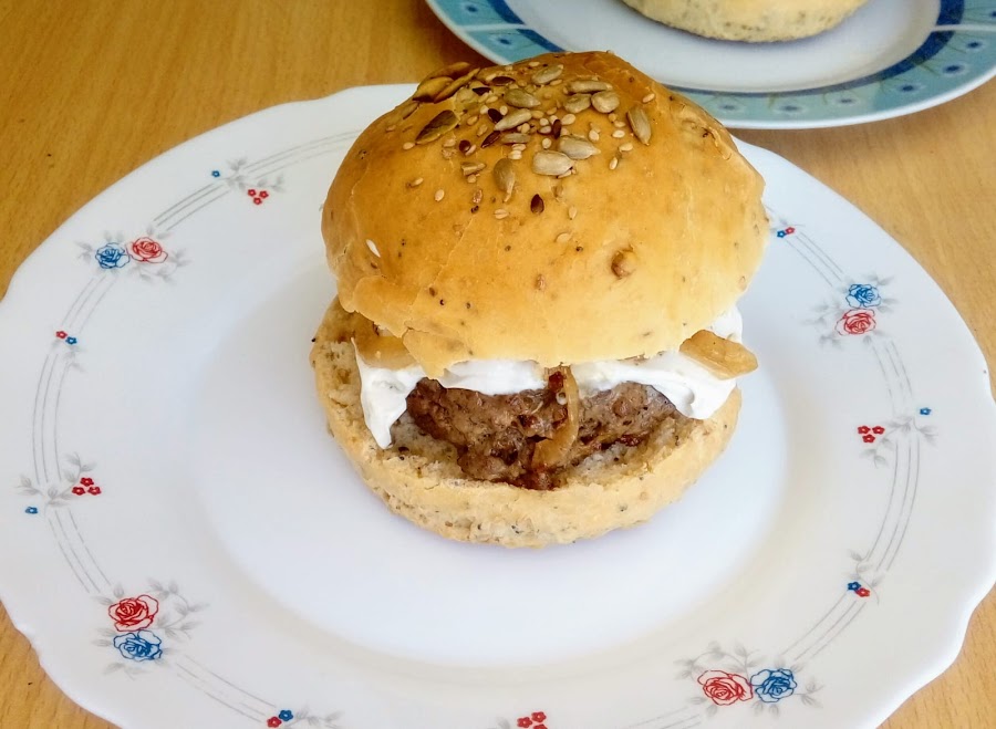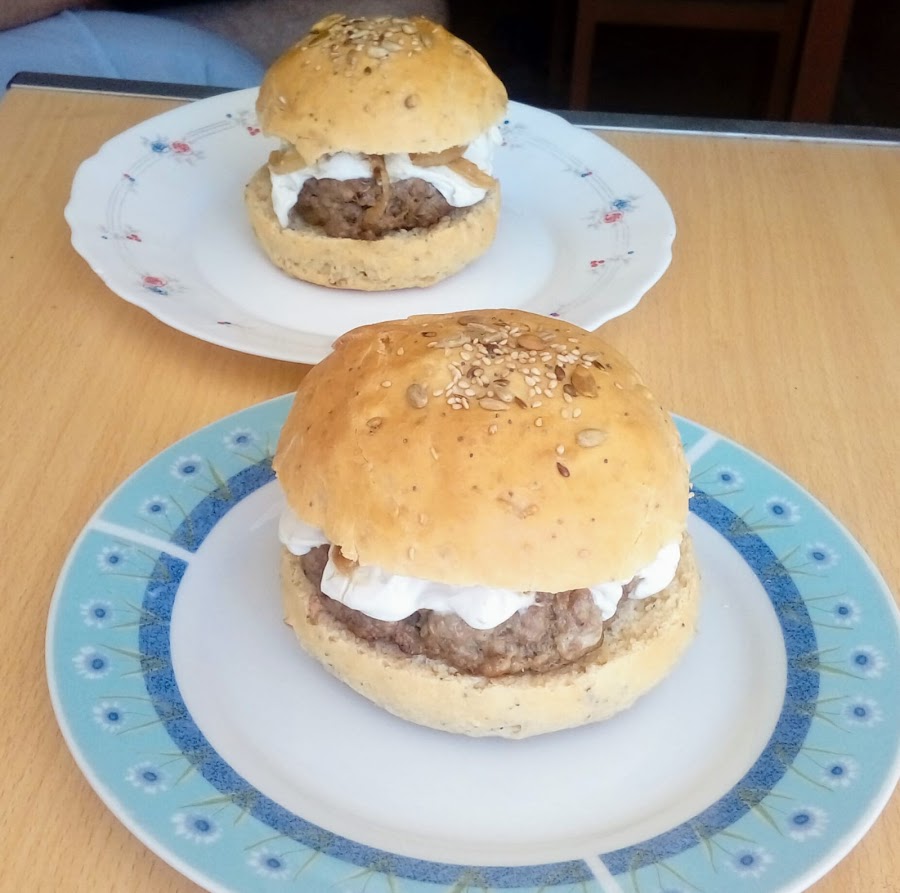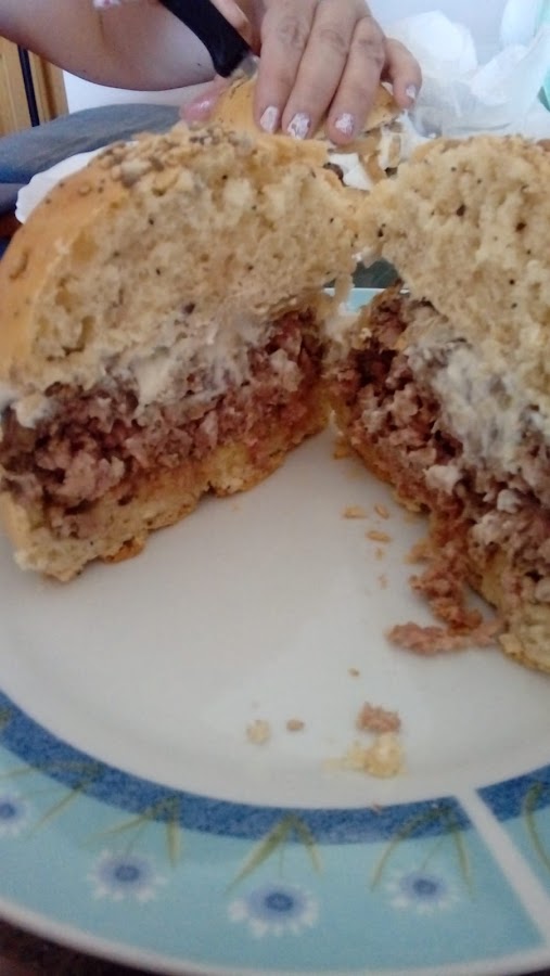 Para la carne de la hamburguesa mezcle todos los ingredientes e hice unas bolas aplastados, las freí en una sartén 2 minutos por cada lado.