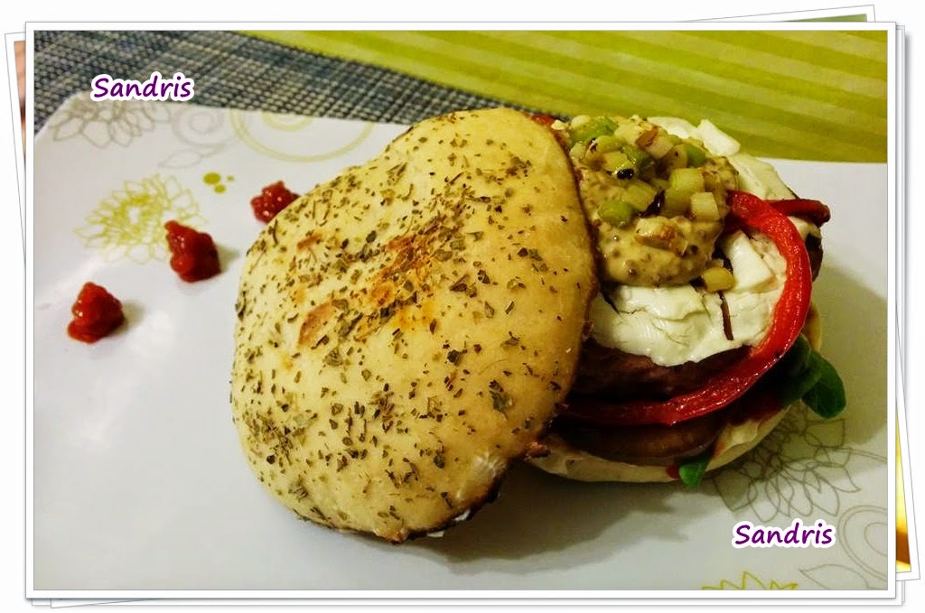 Mostaza a l´AncienneY como siempre... la hamburguesa se me ocurrió sobre la marcha. Tenía claro que algún tipo de lechuga, tomate y algún tipo de queso iba a llevar, pero los otros complementos... fue lo que se me ocurrió en el momento.