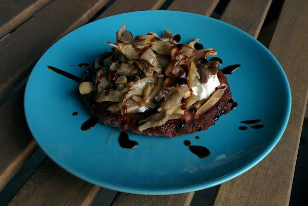 En el plato ponemos la hamburguesa, untamos el queso que queramos por encima al gusto. Echamos las setas por encima del queso. Y decoramos con un poco de crema de vinagre balsámico de trufa (que por cierto, está de muerte).