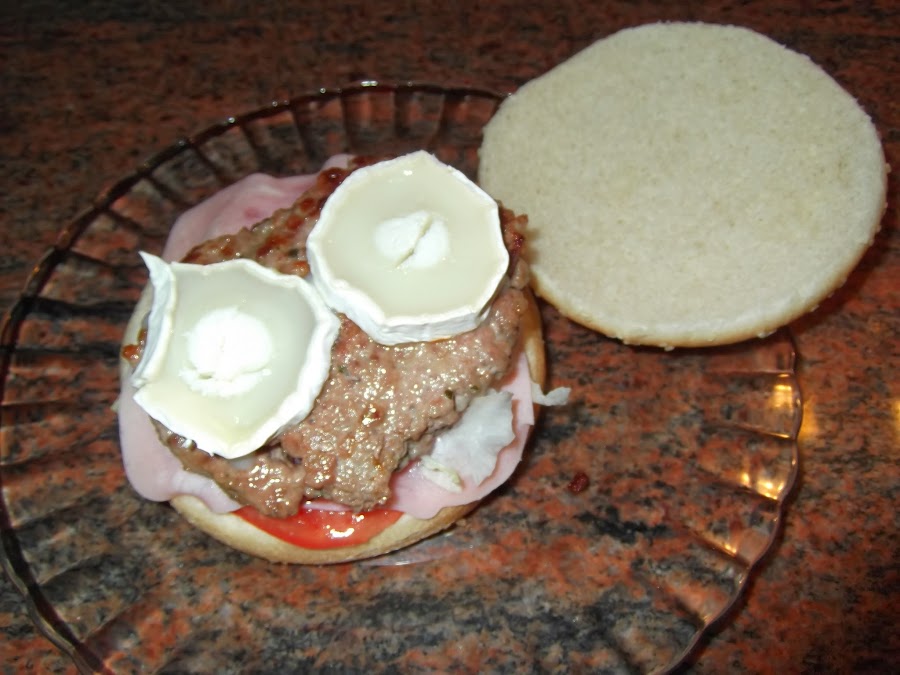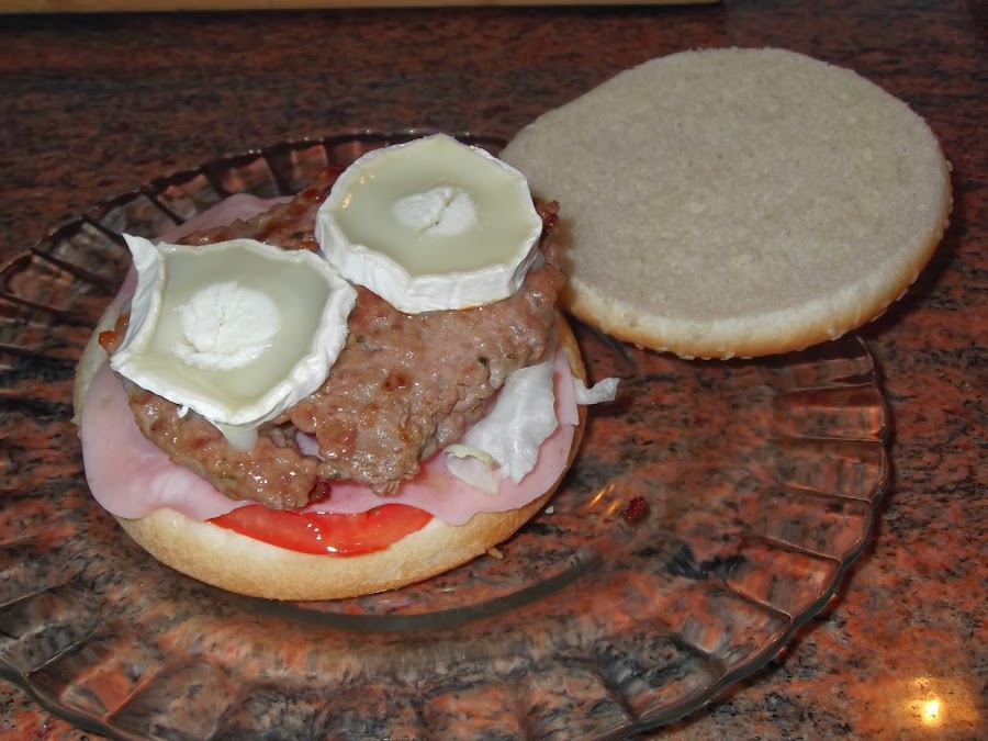 Ahora sólo falta montarla, colocáis el pan, la lechuga, el tomate y la loncha de jamón de york, ya que las rodajas de queso las vais a poner encima de las hamburguesas antes de sacarlas de la sartén para que se hagan un poco. El último paso es colocar la hamburguesa y añadirles las salsas que os apetezcan. Espero que os haya gustado; no obstante, podéis emplear otro tipo de quesos para rellenarlas o sustituir el bacon por jamón de york.