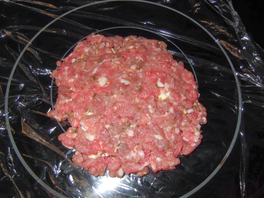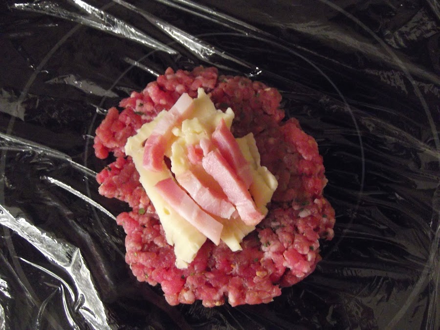 Se revuelve con la carne picada y se comienza a aplastar la hamburguesa, haced una capa muy fina, porque encima vamos a colocar el queso y el bacon, luego hacemos otra capa de carne picada y la ponemos encima. Por eso os digo que no hagáis las diferentes capas muy gordas, ya que si no la hamburguesa tardará bastante tiempo en cocinarse y corréis el riesgo de que se os quede un poco cruda. Lo malo es que si no lo tapáis bien, también corréis el riesgo, sobre todo con el queso, de que se os deshaga en la sartén. Luego las envolvéis en papel film y las dejáis en la nevera hasta que decidáis degustarlas. No obstante si va a pasar mucho tiempo, lo mejor es que las metáis al congelador.