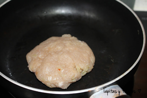 Con las manos húmedas cogemos una porción grande y damos forma redonda.La ponemos en una sartén con unas gotas de aceite.