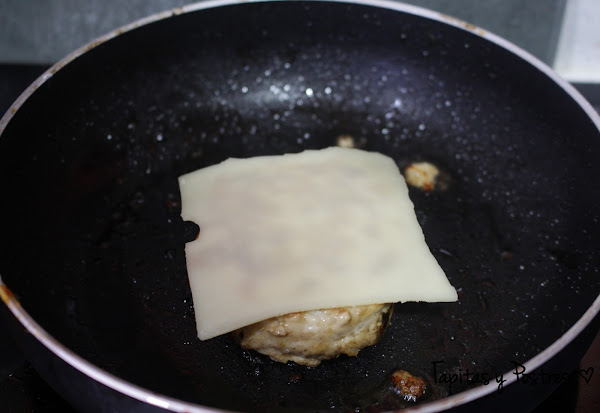 Ponemos una sartén o plancha antiadherente con unas gotas de aceite y cuando esté caliente ponemos la hamburguesa, dejamos que se haga unos minutos y damos la vuelta con cuidado. Cuando esté dorada por los dos lados ponemos una loncha de queso encima y dejamos que se funda.