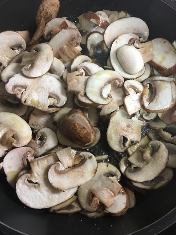 Se pone en una sartén un poco de aceite de oliva y se saltean los champiñones lavados y cortados en láminas. Dejadlos a vuestro gusto, menos hechos o bien esperando a que suelten el agua de vegetación y haciendo que se pongan más marrones.