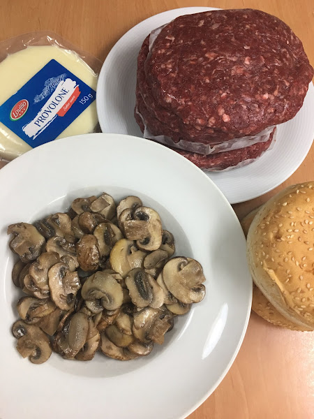 Se sirve de inmediato poniendo la hamburguesa sobre un panecillo ligeramente tostado, cogiendo un poco de queso con una cuchara y poniéndolo por encima y coronando con los champiñones.