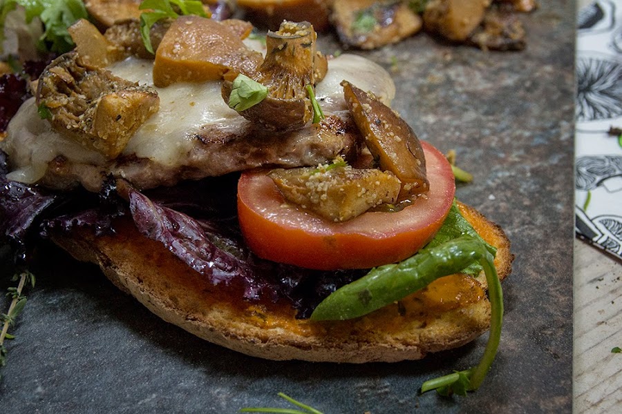 Untamos el pan ya tostado con la salsa romesco y colocamos encima las lechugas ligeramente aliñadas con un poco de aceite y el tomate cortado en rodajas. Colocamos la hamburguesa con el queso por encima y terminamos con los rebollones salteados. Servimos bien caliente.