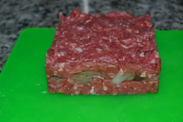 Y volvemos a poner otro poco de carne picada para cubrirla, aplastar bien con una cuchara para que quede bien prensada, o bien con los dedos.