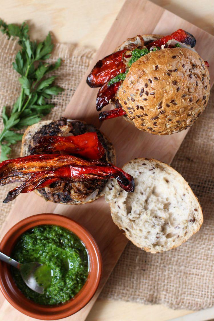 Esta hamburguesa de frijoles negros, shiitake y jalapeños cumple con todos los buenos atributos que mencioné anteriormente y para mi gusto (y el del paladar exigente de Esteban) quedó realmente deliciosa. Lo acompañé con unos pimientos rojos asados, cebolla frita y una salsa chimichurri, una verdadera explosión de sabores del mundo.