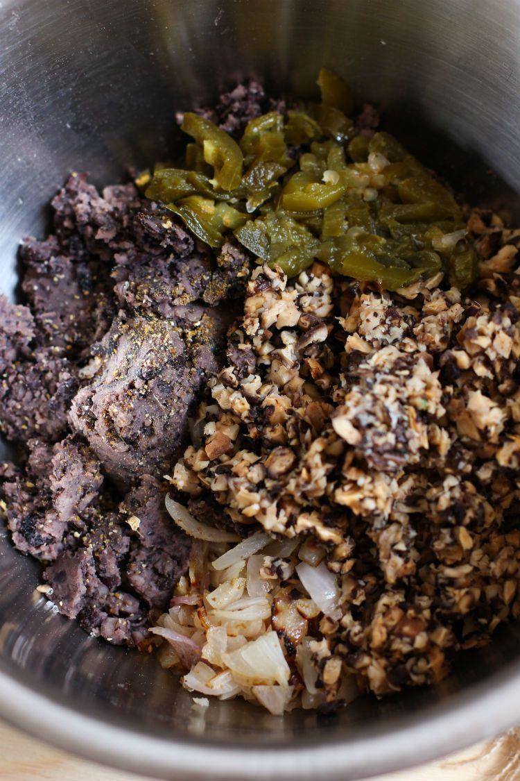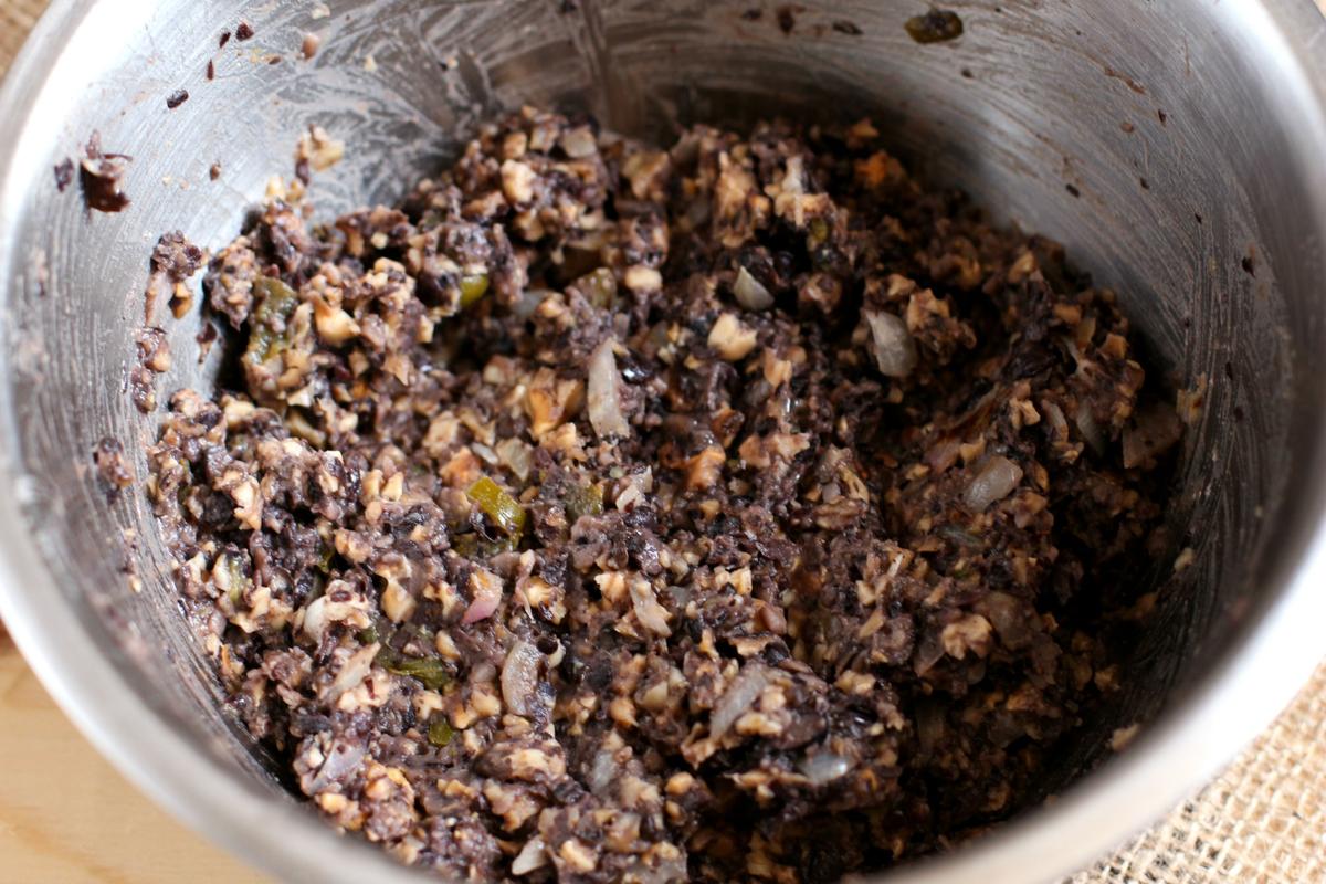 Lavamos los frijoles negros cocidos (yo uso los que vienen en tarro) y luego usamos una procesadora para convertirlos en una pasta (pueden quedar algunos granos no tan molidos). Colocamos la pasta de frijoles en un bowl.