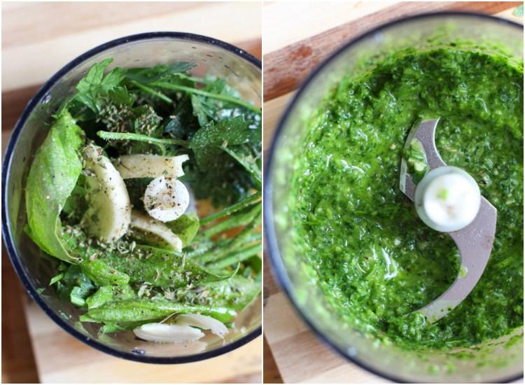 Colocamos 1/2 taza de perejil fresco, 6 hojas de albahaca, 1 cdta de orégano, 1 diente de ajo (sin el corazón para que no repita) y 1 cucharadas de vinagre de vino blanco en una procesadora de alimentos y procesamos hasta obtener una pasta.