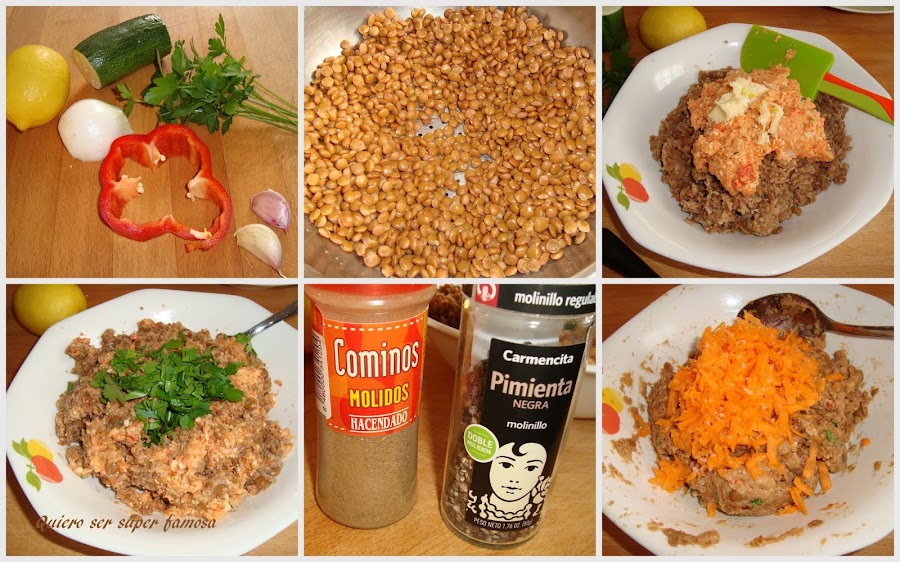 Aparte, triturar muy fino el calabacín, la cebolla, el pimiento y las avellanas. Mezclar con las lentejas.