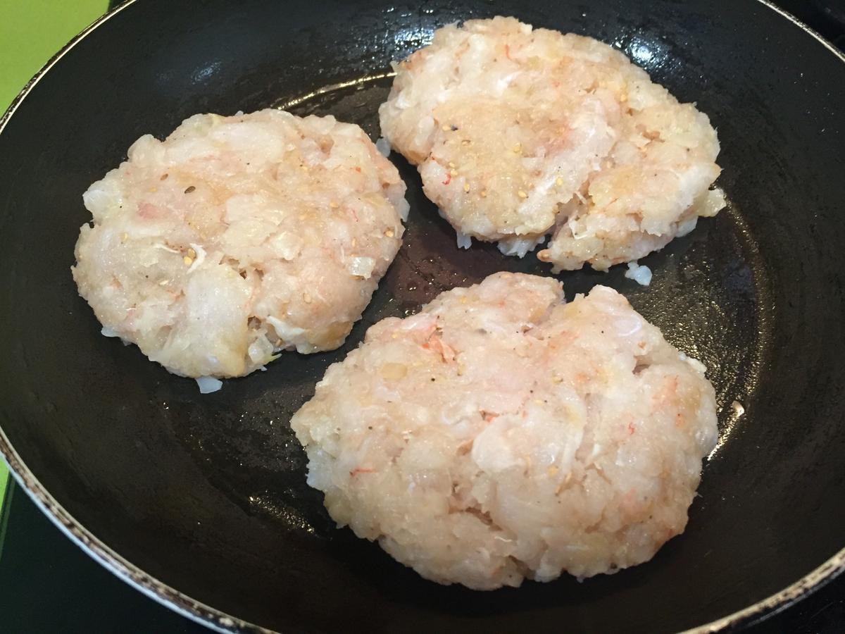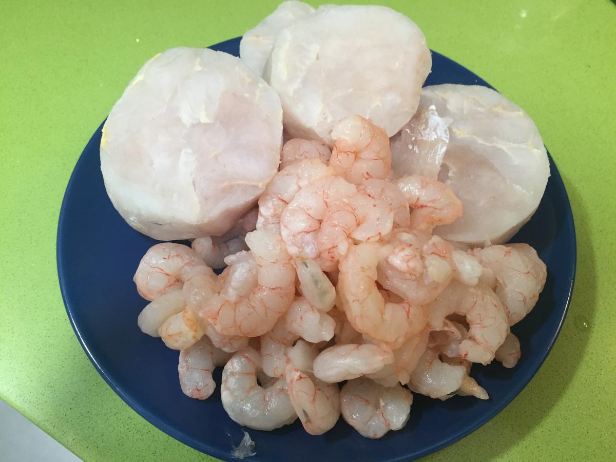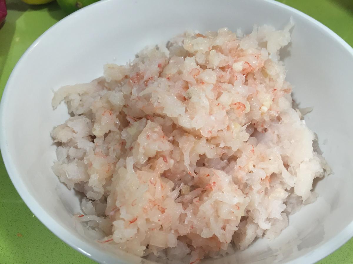 Picamos las gambas, con la media cebolla y el diente de ajo. Unimos a la mezcla anterior.