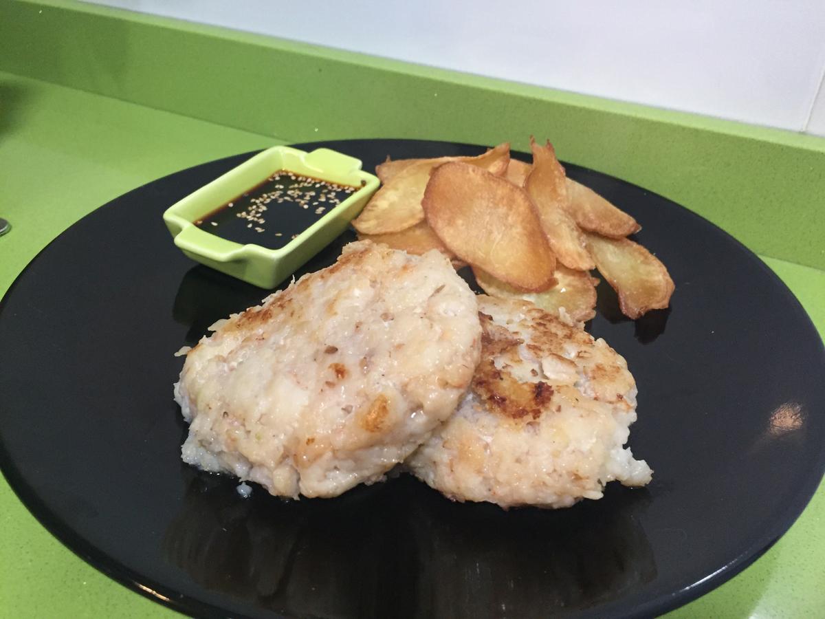 Servimos en el plato las chips y las hamburguesas con un poco de soja con semillas de sésamo al lado.