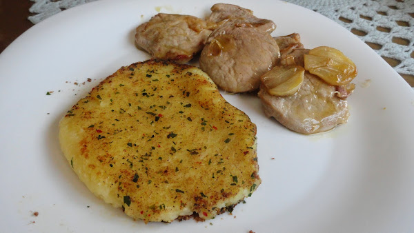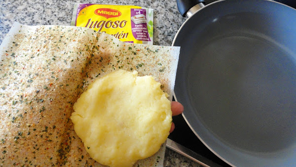 En mi caja de MUESTRAS PREMIUM de este mes, entre otros producto que más abajo os cuento, traía dos sobres de jugoso a la sartén, de maggi, y que son para preparar pechuga de pollo. Son hojas impregnadas de especias varias, en las que se introduce un filete de pollo y se prepara en una sartén bien caliente sin añadir aceite. Yo le he dado una "mariversión" utilizándolos para estas hamburguesas de patata cocida que hemos comido como guarnición de unos filetitos de solomillo al whisky.