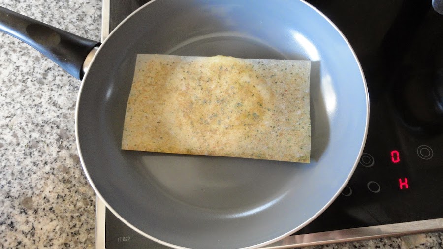 Para tres hamburguesas he cocido con piel dos patatas medianas. Cuando han templado las he pelado y pasado por el pasapuré, a continuación le he dado forma, las introducimos en la papel de jugoso a la sartén. Ponemos la sartén al fuego sin nada de aceite, y cuando esté caliente vamos pasando las hamburguesas de patata cocina dentro del papel de jugoso a la sartén, por ambos lados hasta que las especias impregnadas en el papel pasan a las patatas. Están muy ricas. Estas son de jugoso a la sartén al ajillo, y el otro que he recibido es de finas hierbas.