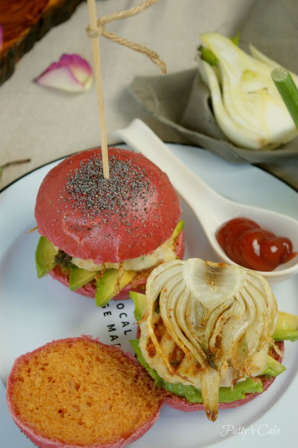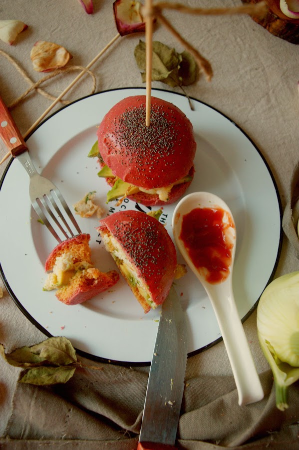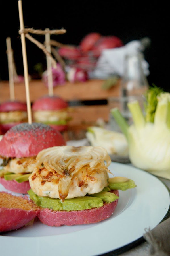 Para hacer esta receta he ido cogiendo un poco de aquí, otro de allá, y otro poco de mi cosecha. Los panecillos de remolacha están adaptados de Merceditas Bakery, la hamburguesa de pescado, una adaptación de Guía infantil y el hinojo de Alimentarte.com. El resultado: una hamburguesa gourmet, digna del mejor chef hamburguesero, ligera y muy atractiva, con unos colores muy seductores que van a hacer que no puedas decirle que no.