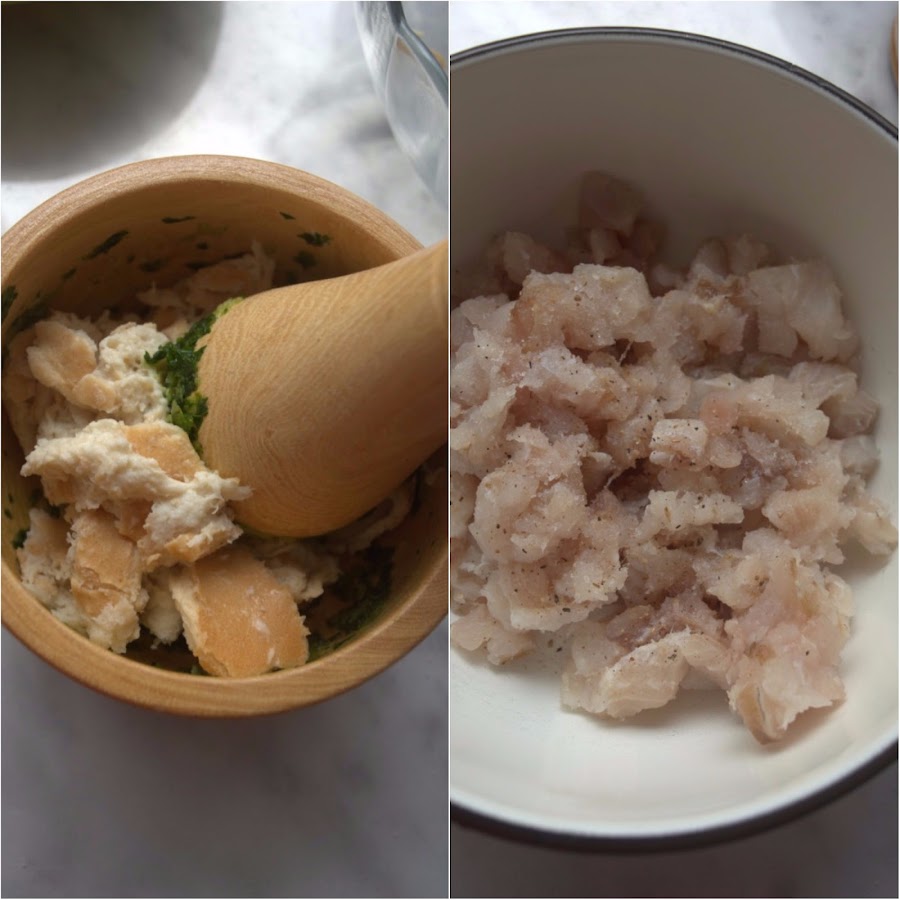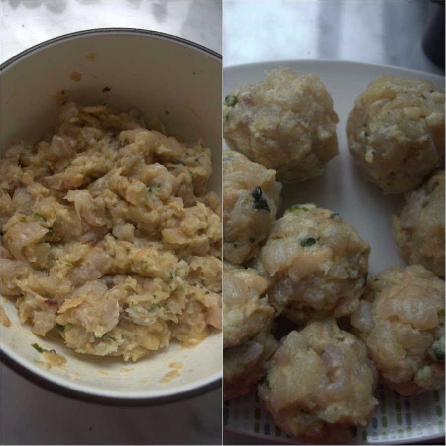 Cut fish in very small pieces and plac ein a bowl. Add the rest of the ingredients and the egg. Mix well. You will have a sticky dough but pliable. Cover with a cling film and keep into the fridge for 30-45 minutes.