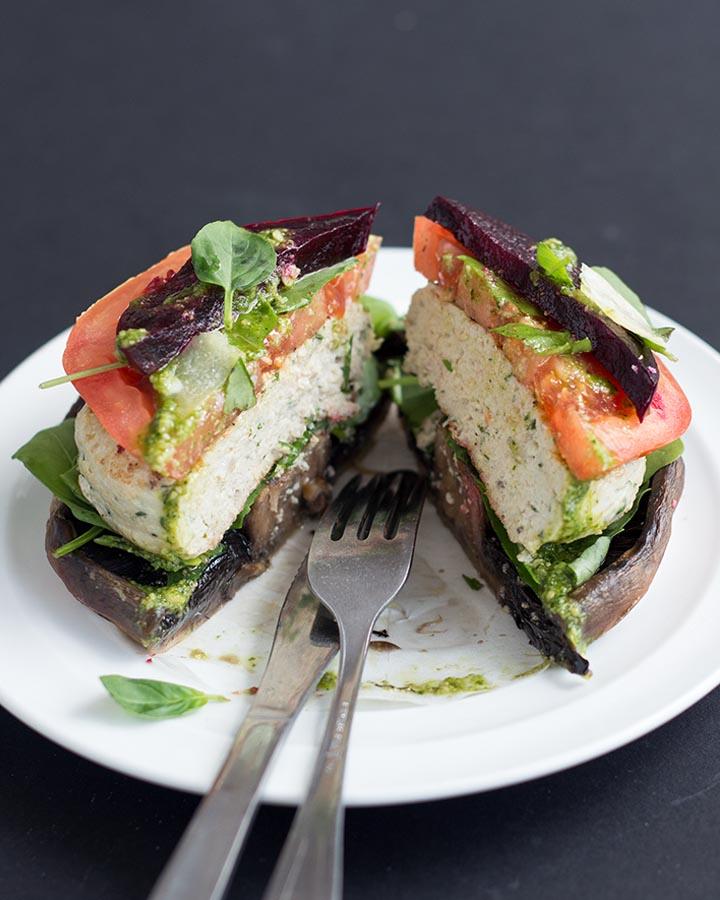 Monta las hamburguesas: coloca el champiñón y encima unas hojas de rúcula. Ahora pon la hamburguesa, encima coloca una rodaja de tomate y sobre ésta más hojas de rúcula. Por último añade unos trozos de remolacha y la salsa pesto. Decora con alguna hoja de albahaca o con lascas de queso parmesano. ¡Disfruta de tu hamburguesa!