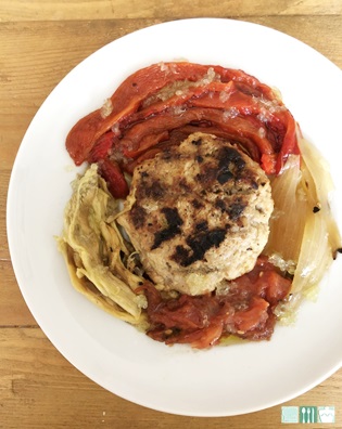 Y hoy he vuelto a vestir el plato bonito, con una hamburguesa de pollo y coco (que me encanta) acompañada de una escalibada hecha con cariño y que decoraba mi plato como si de un mandala se tratara.