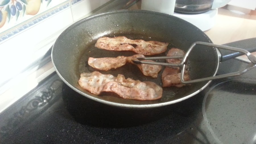 freimos el bacon sin echar nada de aceite en la sarten, no hace falta, ya lo suelta el bacon