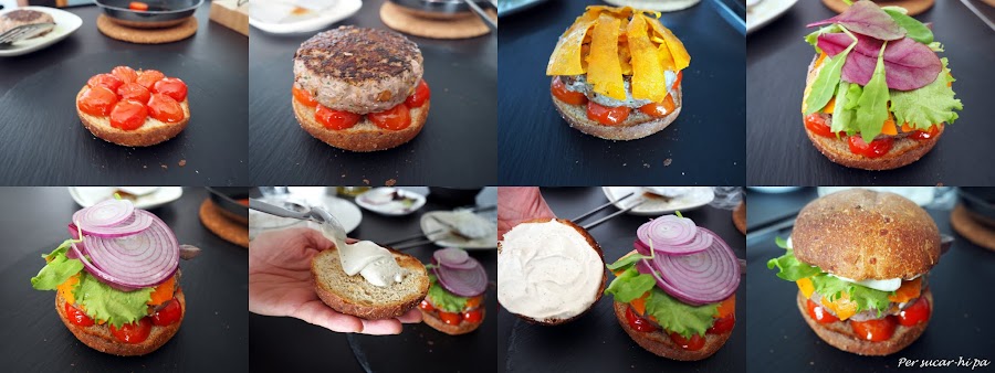 Cocinar la hamburguesa por ambas caras según el punto a que os guste la carne y tostar ligeramente el pan. Aquí hemos utilizado unos bollos caseros de pan deli (hacer clic aquí para ver la receta), aromatizados con cebolla y alcaravea.