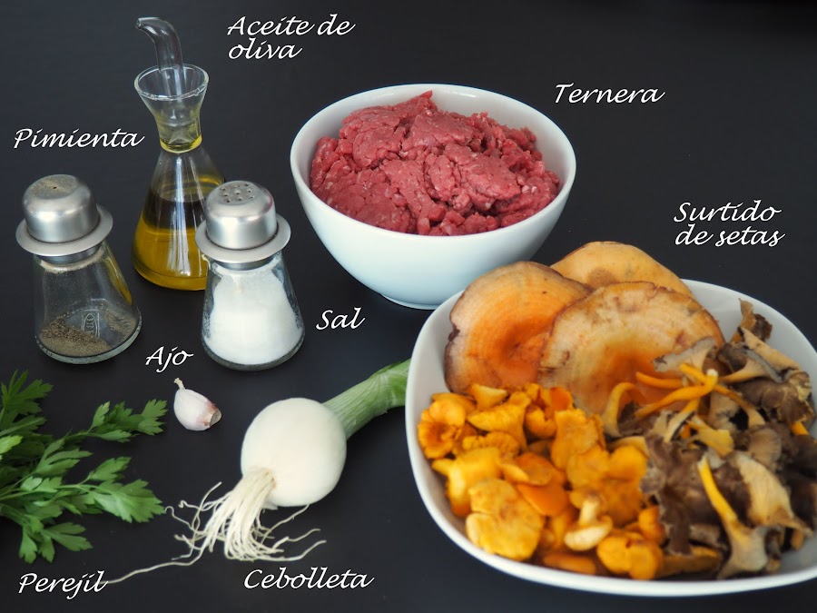 En un bol disponer todos los ingredientes: la ternera picada salpimentada, la mezcla de setas pochadas y el perejil fresco picado fino . Mezclarlos hasta conseguir una pasta homogénea. Formar las porciones y dar forma a las hamburguesas. Podemos hacer entre 6 y 8 unidades en función de lo gruesas que las queramos.