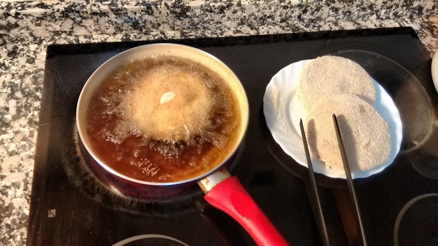 Empanamos, pasando siempre por pan rayado, huevo y otra vez pan rayado.