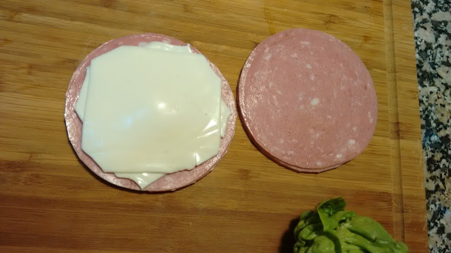 Ponemos las dos lonchas de queso en medio de las rodajas de mortadela.