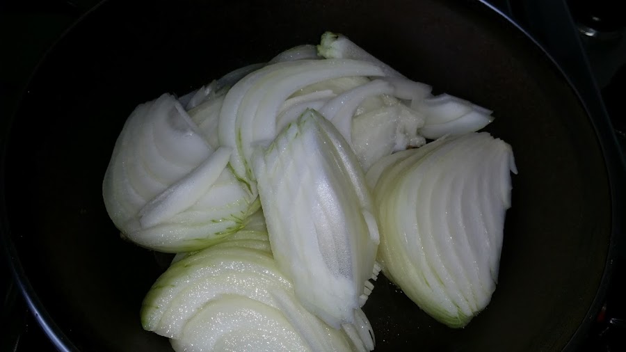 Lo primero que haremos será cortar la cebolla el juliana y ponerla a pochar en una sartén con un poco de aceite y sal y tapada.