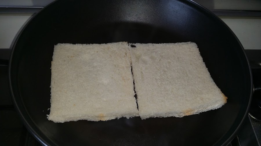 Si tenéis horno o tostadora, podéis tostar un par de rebanadas de pan de molde, sino, lo podéis hacer como yo, en una sartén con una gota de aceite.