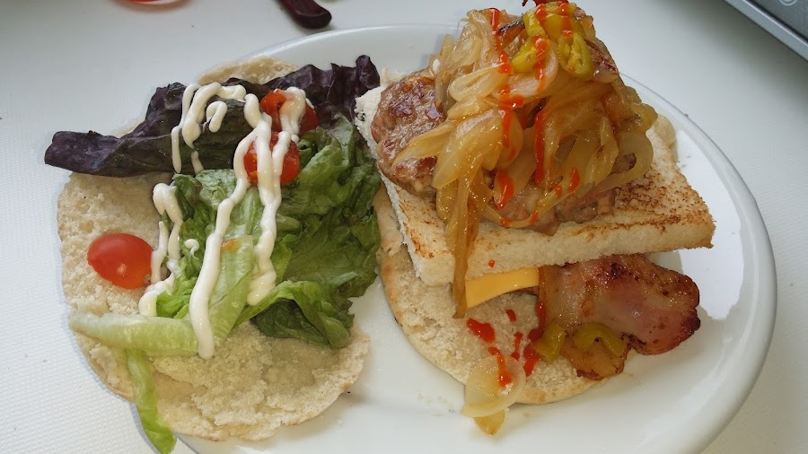 Ahora solo queda montar la super hamburguesa: Ponemos el pan de pita como pan base, ponemos en un lado un poco de verde, lechuga y tomates con un poco de mayonesa. Por el otro lado, ponemos una hamburguesa con un poco de mostaza y una tira de bacon seguida de una loncha de queso, justo encima la rebanada de pan de molde y sobre esta, la otra hamburguesa con la cebolla que habremos caramelizado y un poco de salsa sriracha. Decoramos con guindilla troceada y a disfrutar!