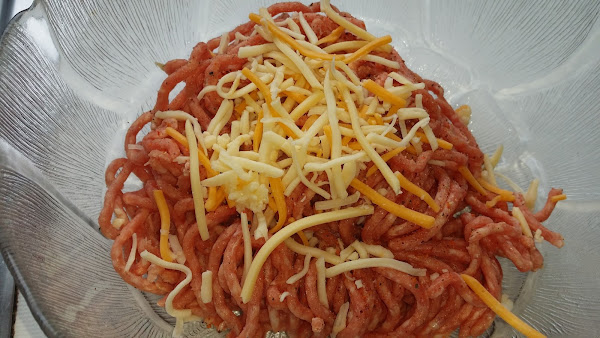 A parte, en un bol, mezclaremos 500gr de carne picada, ya sea de cerdo, vacuno o pollo, lo que más os guste, con un poco de queso rallado, sal y pimienta.