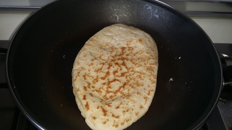 Una vez el pan de molde tostado, pasaremos por la sartén el pan de pita, aunque, al igual que en el caso anterior, se puede hacer al horno o en una tostadora.