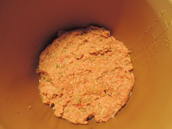 Poner unas gotas de aceite en la cubeta de la olla y echamos la mitad de la mezcla de hamburguesas.