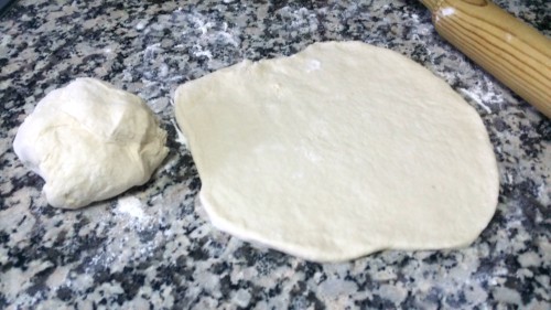 Con la mesa espolvoreada con harina, dividir la masa en dos bolas de unos 450 gramos cada una. Aplastar con el rodillo ambas, como si fueran dos pizzas de unos 28 centímetros.