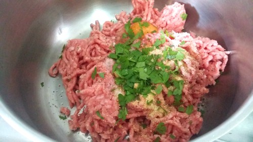 Adobar la carne con 1 huevo, 1 cta. pequeña sal, pimienta, ajo en polvo, cebolla en polvo y perejil.