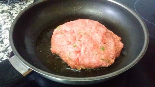 Engrasar una sartén con aceite y sellar la hamburguesa. Sólo dorar la carne por fuera. Dejar enfriar.
