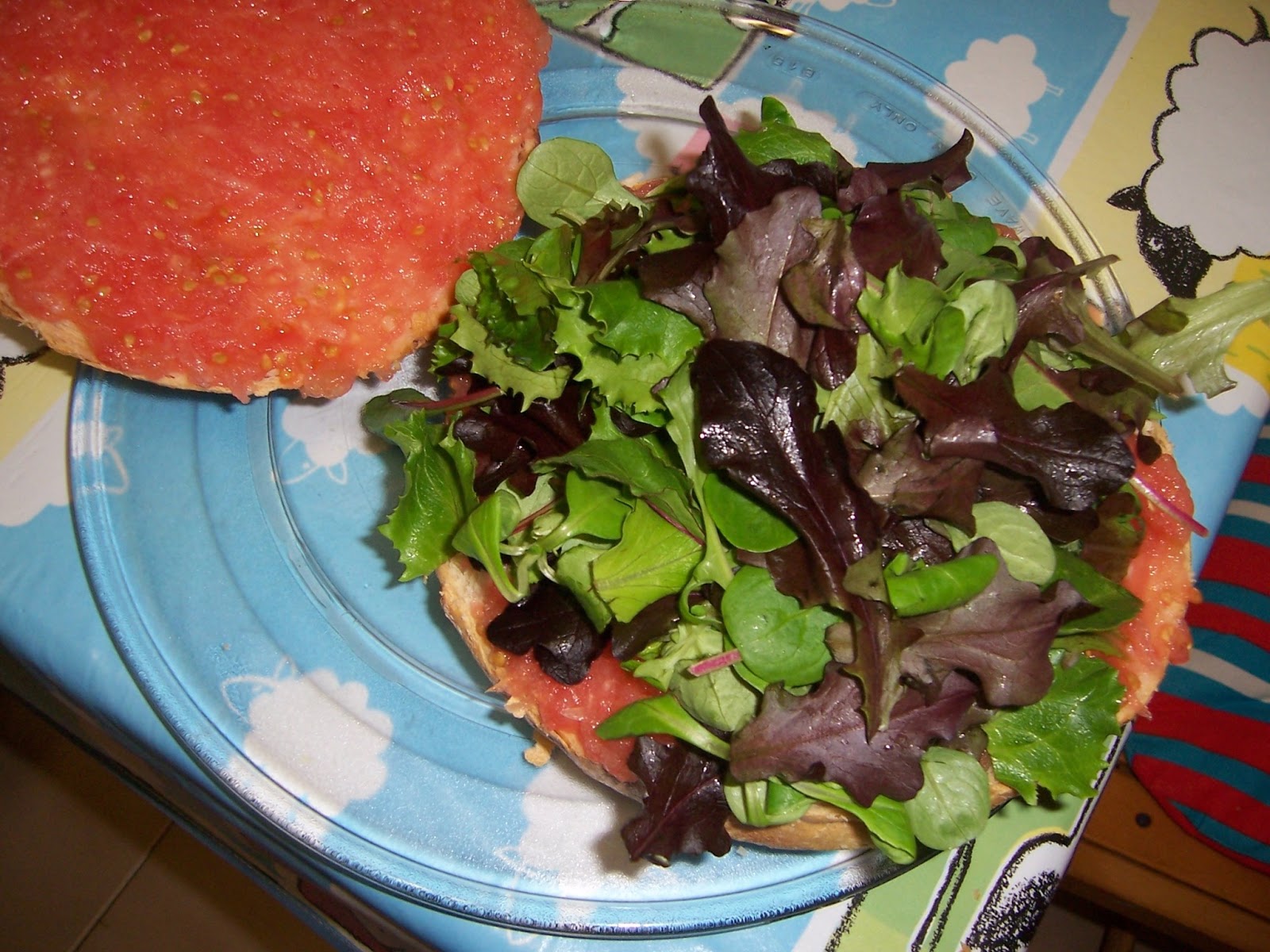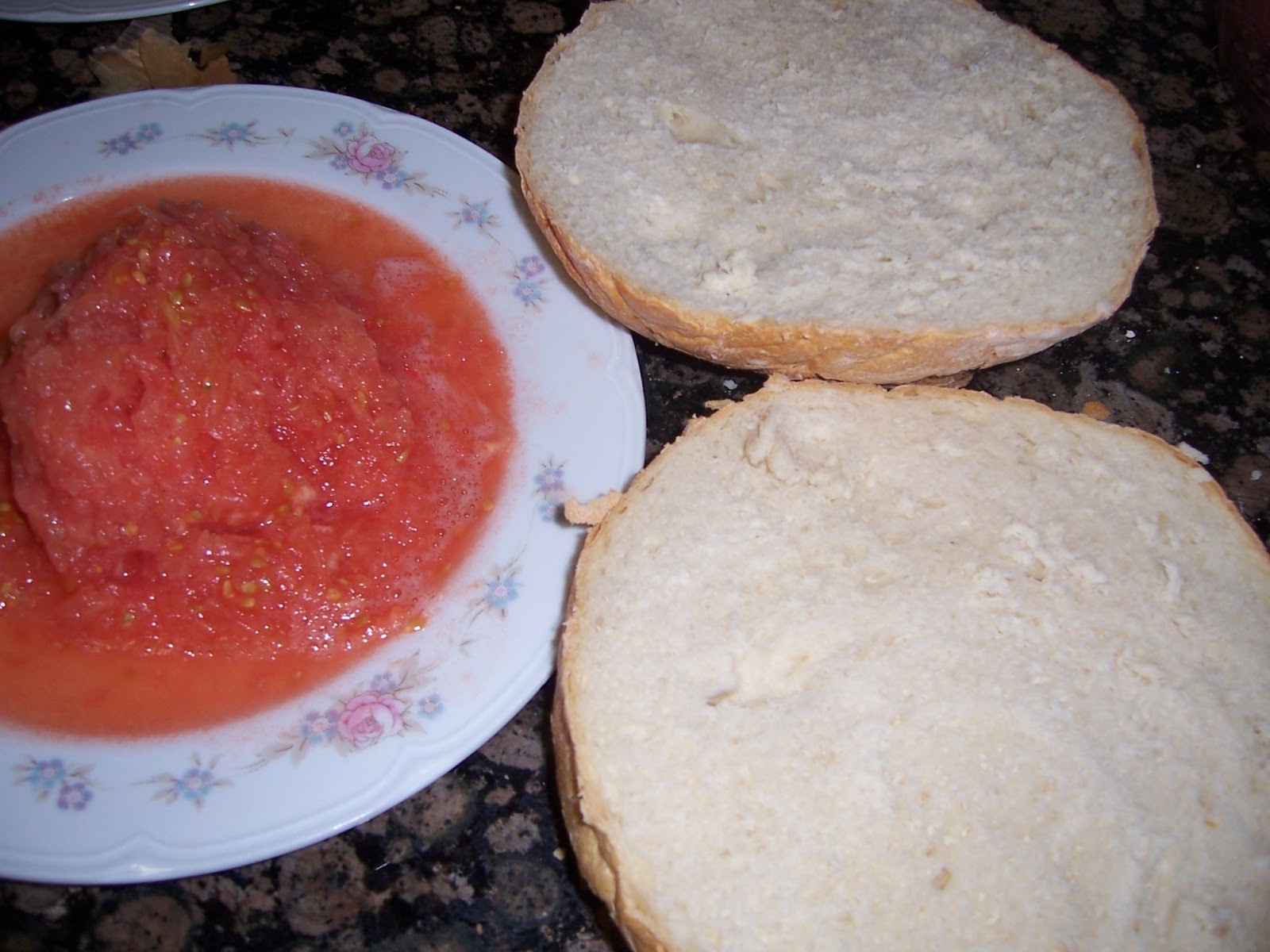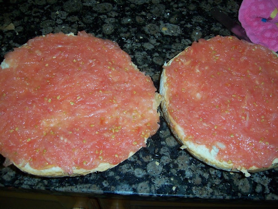 Rallamos lo tomates y untamos el bollo de pan, las dos partes, la de arriba y la de abajo y lo dejamos reposar, de esta manera el tomate va mojando la miga del pan y queda mucho más jugosa (si usáis pan de hamburguesa de bollo poner el tomate en rodajas si no se os desharía.)