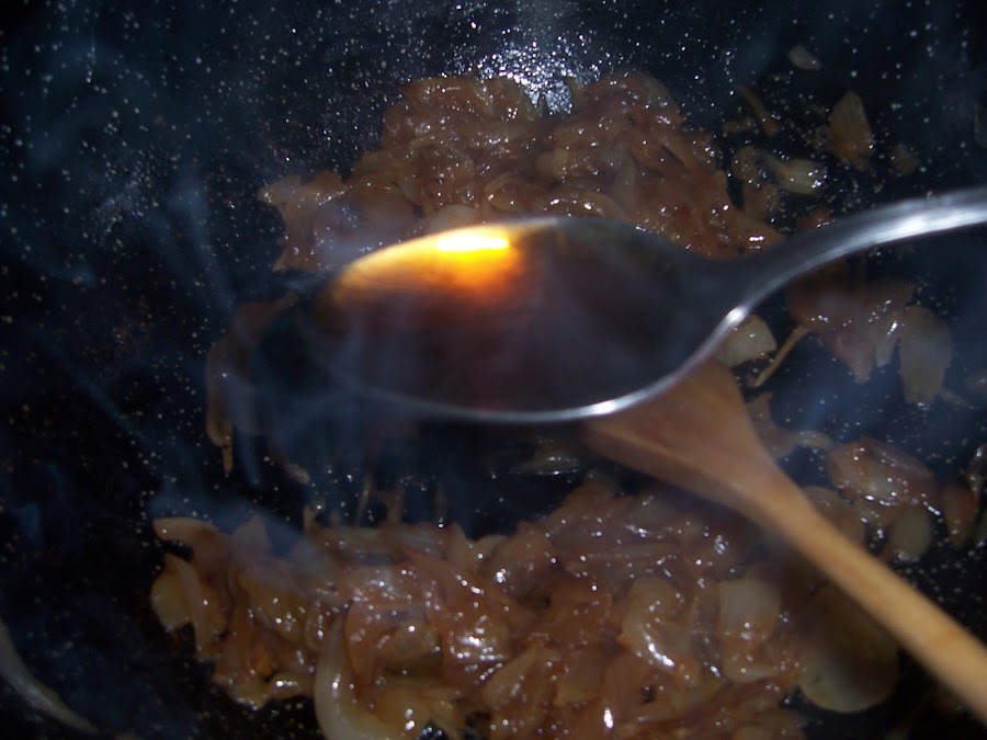 En primer lugar caramelizamos la cebolla, la cortamos en tiras y la ponemos a pochar con un chorrito de agua durante unos 20 ó 30 minutos hasta que esté dorada y suelte casi toda el agua, en ese momento añadimos la cucharada de azúcar dejamos que se caramelice durante un par de minutos y añadimos la cucharada de vinagre para evitar que el azúcar se cristalice, apartamos.