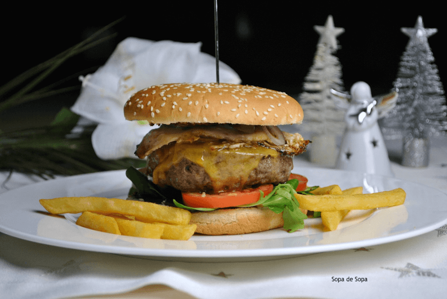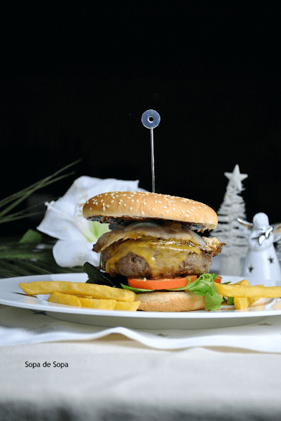 Ahora la hamburguesa de carne, el queso, el pepinillo, el huevo y la cebolla.