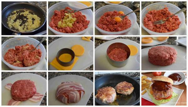 Elaboración de la hamburguesa rellena de queso y envuelta en panceta: