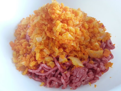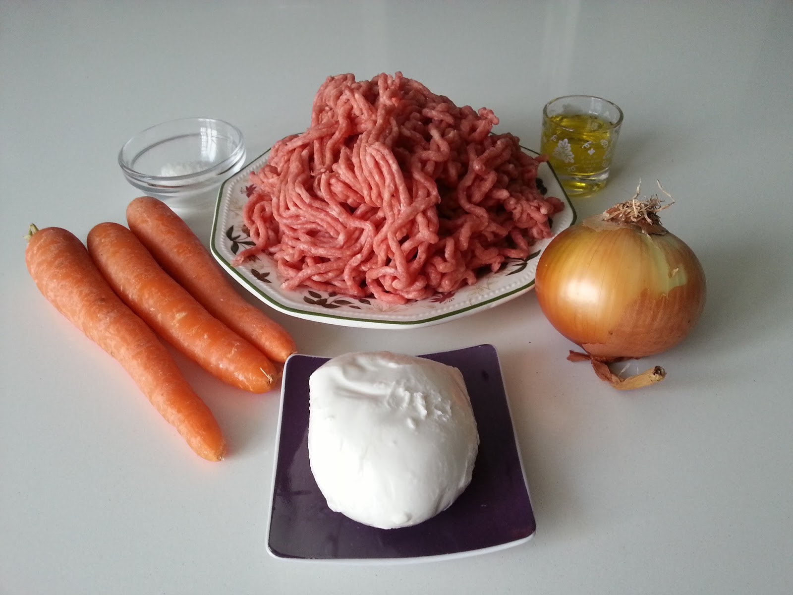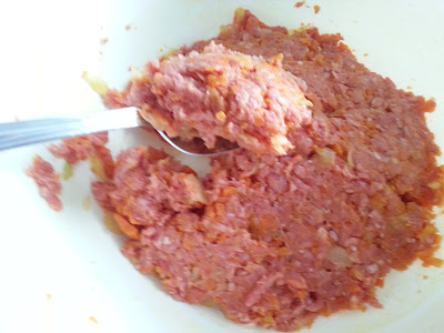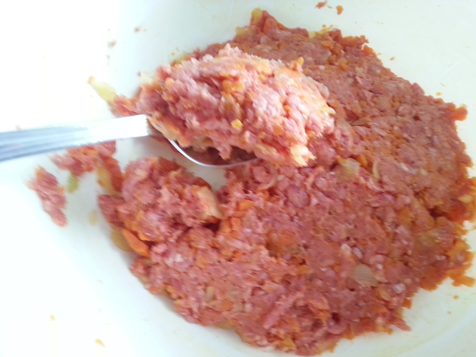 5. - La carne picada la ponemos en un bol, la sazonamos y le añadimos el sofrito de la cebolla con la zanahoria.