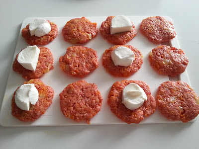 8. - Cortamos la bola de mozzarella en los trozos que vayamos a emplear, en este caso 7. y vamos colocando sobre la mitad de las hamburguesas.